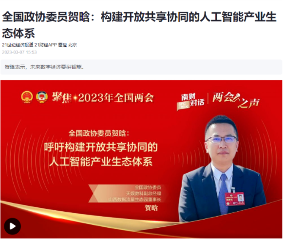 新華社客戶端 | 全國兩會專題報道全國兩會已經(jīng)召開,第十四屆全國政協(xié)委員,天娛數(shù)科董事、副總經(jīng)理賀晗,針對我國人工智能產(chǎn)業(yè)生態(tài)體系的三大短板,提出要加快推動數(shù)據(jù)要素高效流