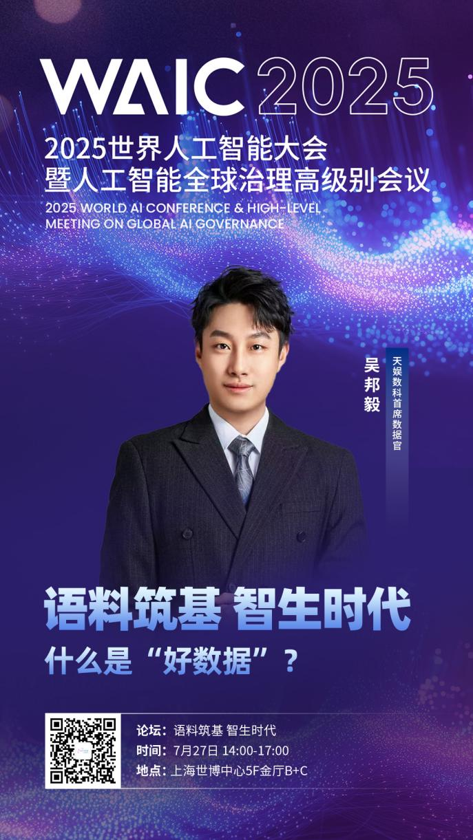 2025年7月26日至28日,世界人工智能大會(WAIC 2025)在上海世博中心盛大舉行。其間,天娛數科受邀出席7月27日下午的“語料筑基 智生時代”語料創新發展論壇,天娛數科首席數據官吳邦